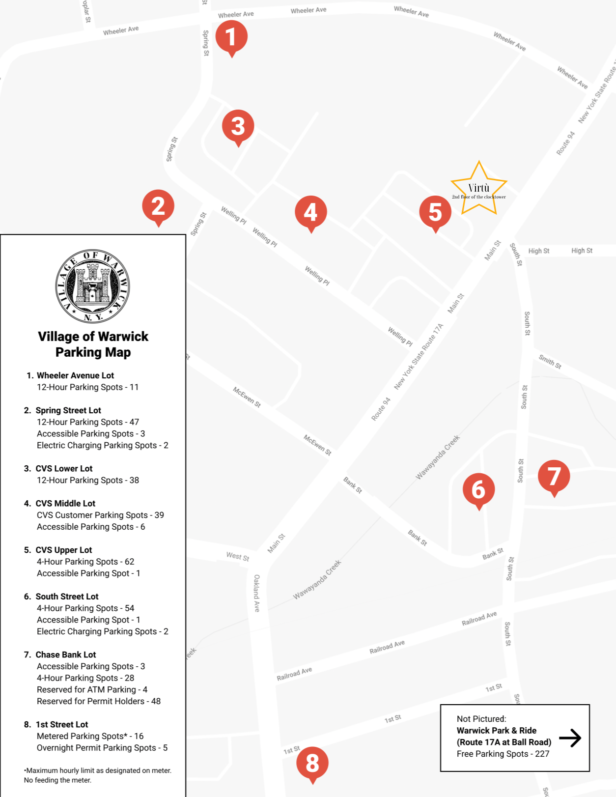 Virtù is located on the 2nd (walk up) floor of the historic clocktower building in downtown Warwick, NY. The Clocktower building is adjacent to CVS and shares public parking with the Upper CVS parking lot.